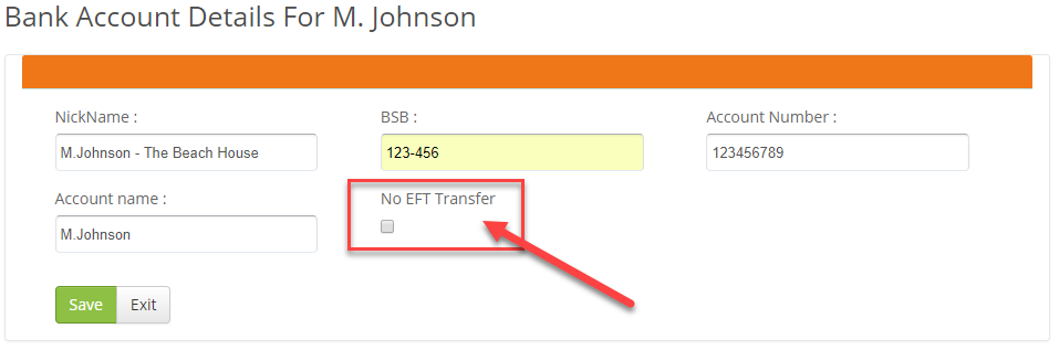 If you don't want to include this owner's record in the ABA file, select the No EFT Transfer check box. (this field in unticked by default)