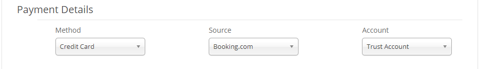 - Under Payment Details select the payment method, booking source and the account where the payment was received