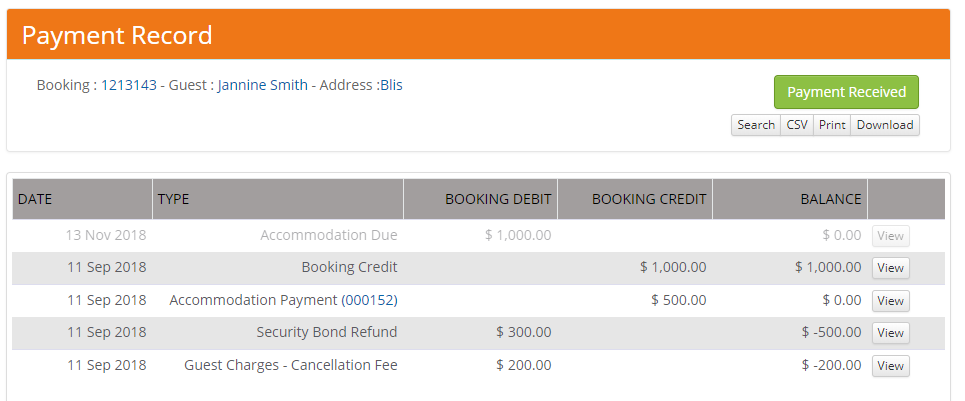 - Security Bond Refund record for the amount that needs to be refunded to the guest (deposit taken minus cancellation fee)